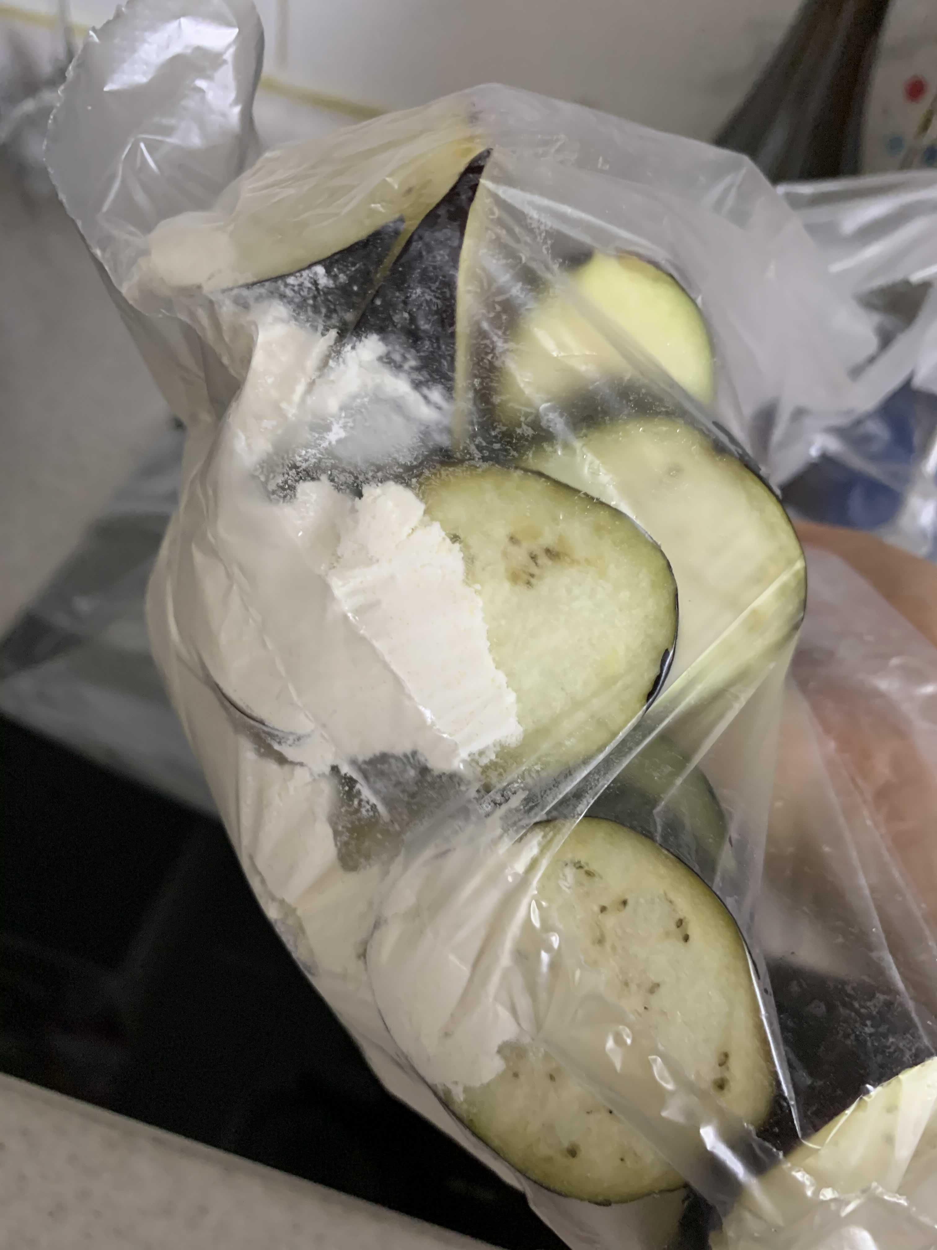 봉지에 튀김가루 약간 넣고 소금간 살짝 솔솔 뿌려준 후 가지를 넣고 흔든다.
